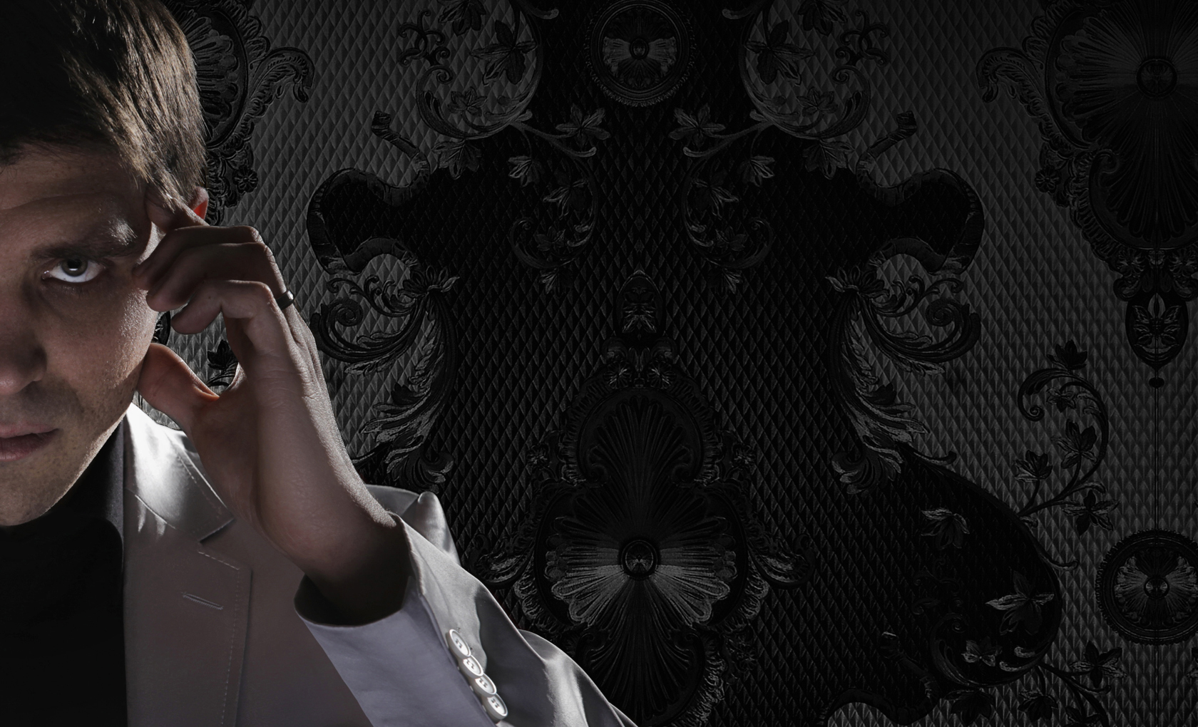 mentalist linke seite 09. Dezember 2025 Zauberer Keine Gedanken Mentalist David Pricking mit mentaler Pose auf der linken Seite vor farbloser Tabete.