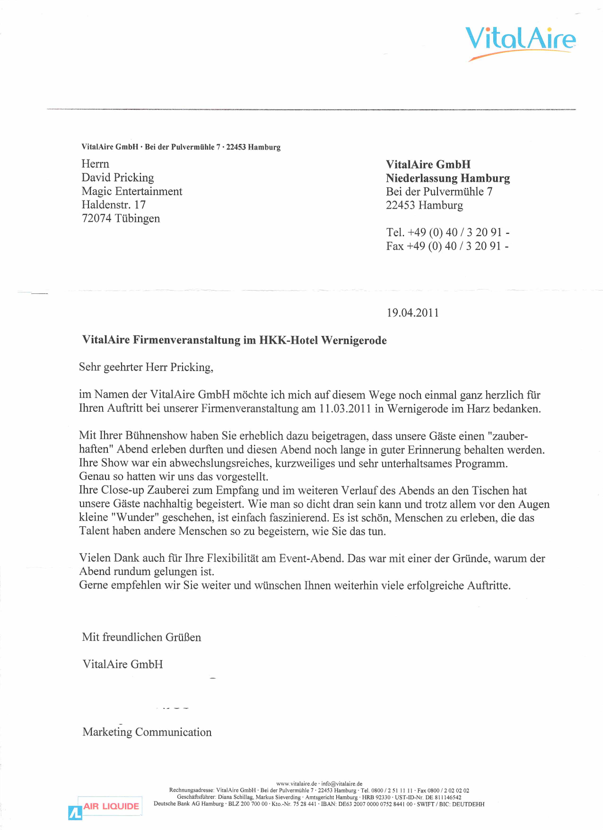 VitalAire Close-up Bühnenshow 09. Dezember 2025 Zauberer Keine Gedanken Refernzschreiben von der VitalAire GmbH